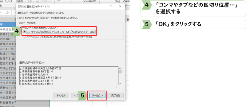 「区切り位置指定ウィザード」が表示されます。「元のデータの形式」で「コンマやタブなどの区切り文字によって…」を選択し、「次へ」をクリックします。