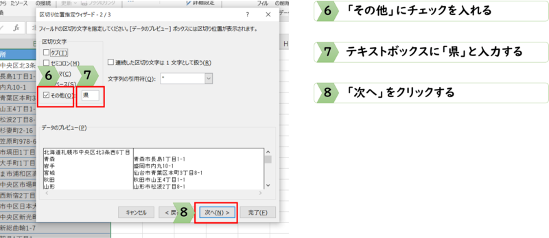 「区切り文字」の項目で、「その他」にチェックを入れ、テキストボックスに「県」と入力します。これで、「県」という文字で住所を区切る設定になります。