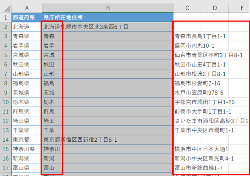 また、「東京都」「北海道」「京都府」「大阪府」のように「都」「道」「府」で終わる住所は、この方法では一括で分割できません。これらの住所は手作業で修正するか、関数(LEFT関数、FIND関数など)を組み合わせる必要があります。