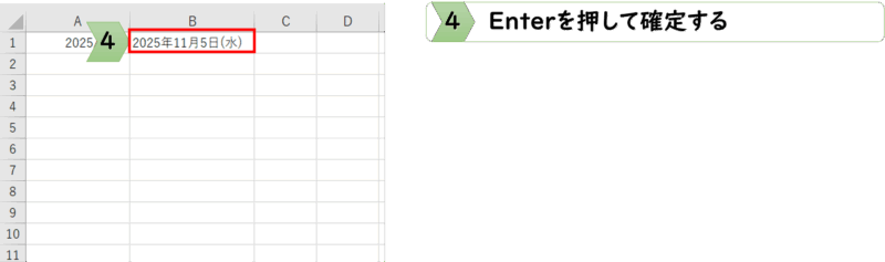 結果として、B1セルには「2025年11月5日(水)」という文字列が表示されます。