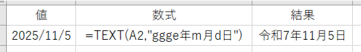 - 数式:=TEXT(A2,”ggge年m月d日”)