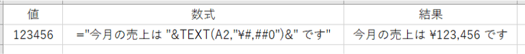 - 数式:=”今月の売上は “&TEXT(A2,”¥#,##0″)&” です”
