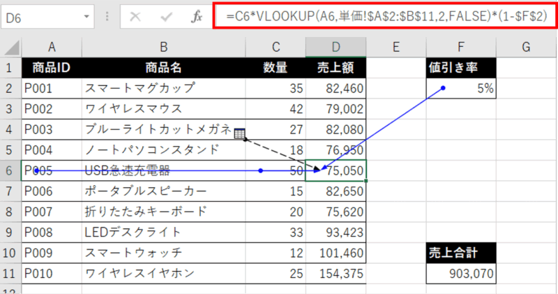 参照元となるセルから選択したセルに向けて、青い矢印が表示されます。- 参照元が同じシート内にある場合は、そのセルとの間に矢印が引かれます。