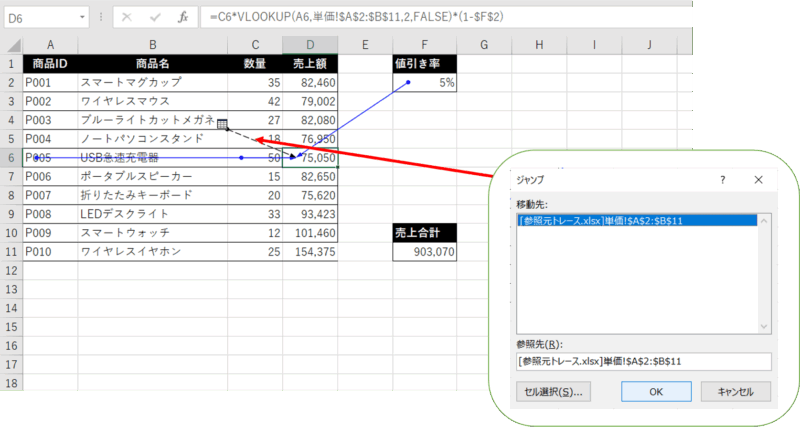 この矢印をダブルクリックすると、「ジャンプ」ウィンドウが表示され、参照元のセルを特定できます。ここからジャンプすることも可能です。