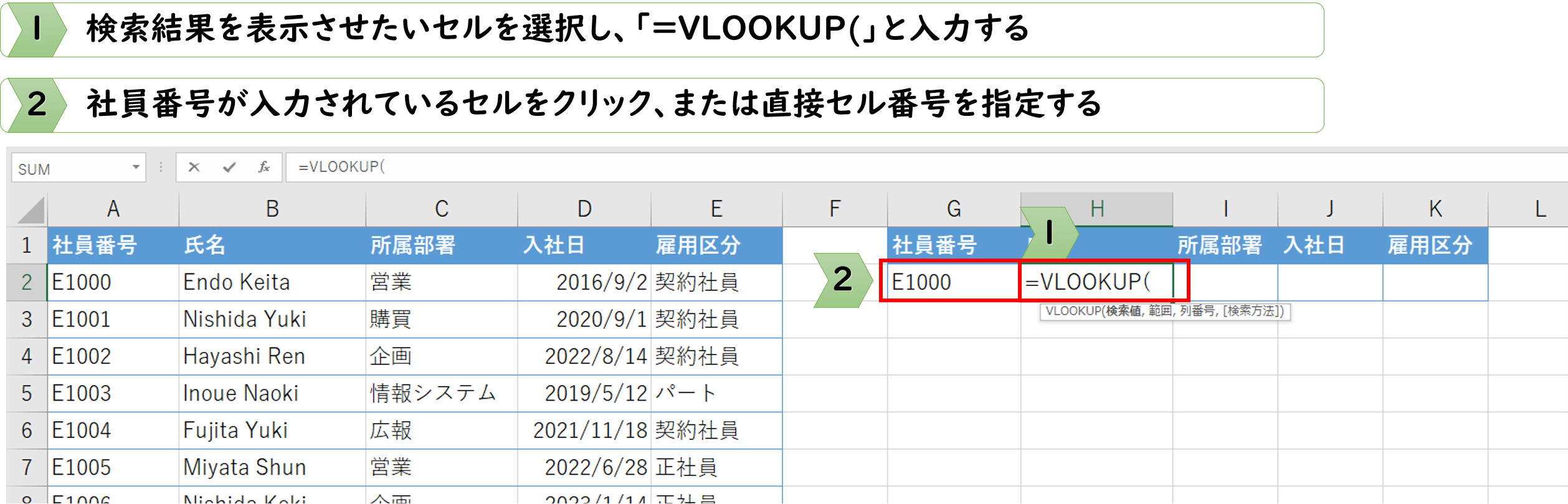 今回は、社員名簿から「社員番号」を使って「氏名」を取り出す操作を例に解説します。
