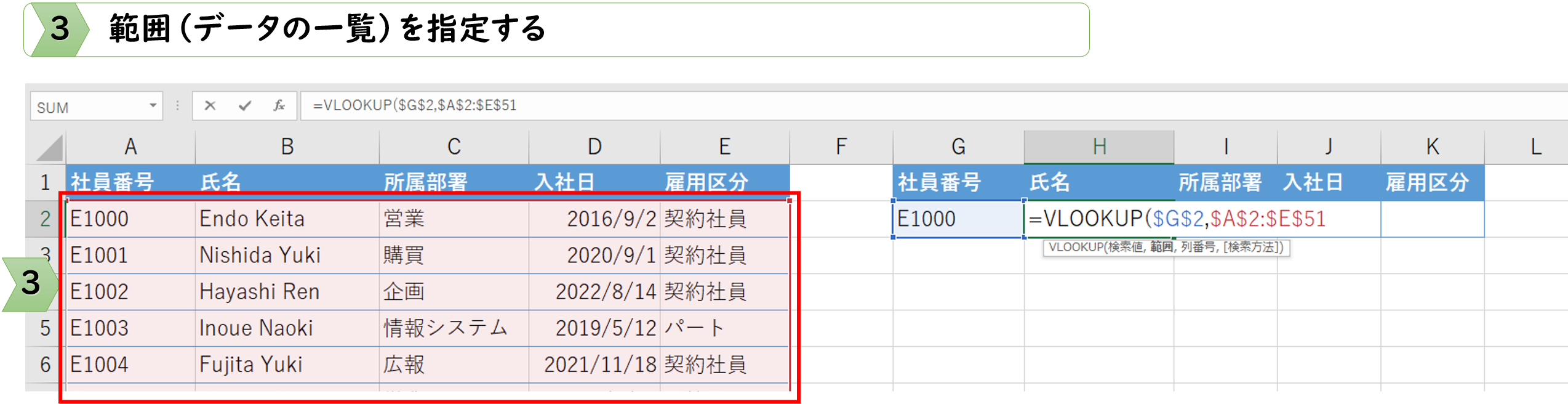 ​重要: 検索値が、選択した範囲の一番左側の列にある必要があります。​