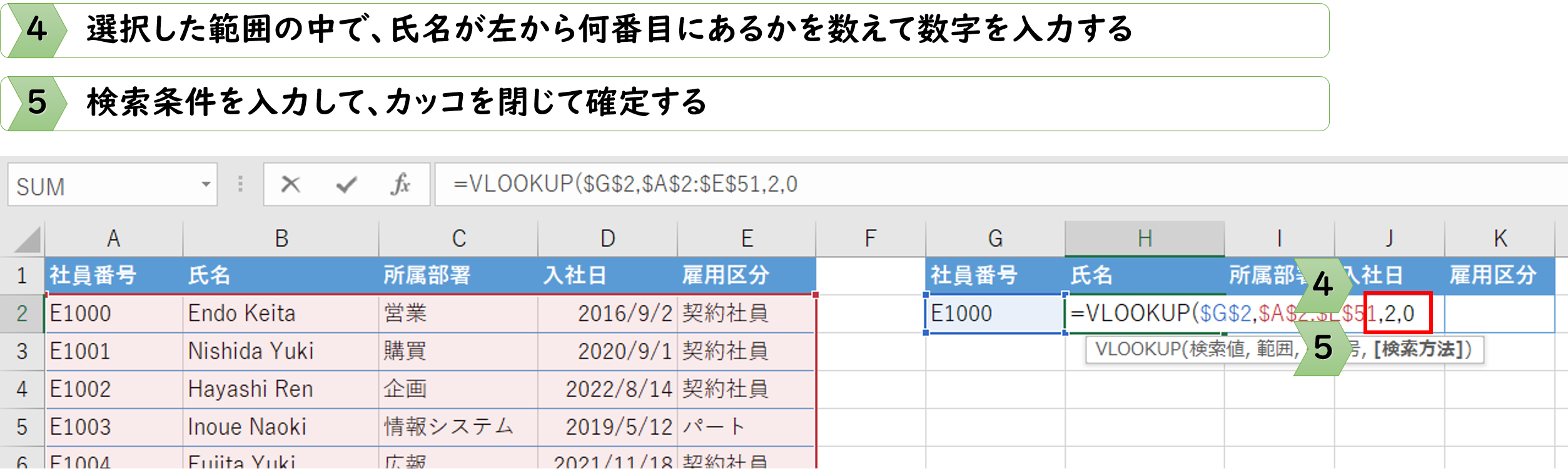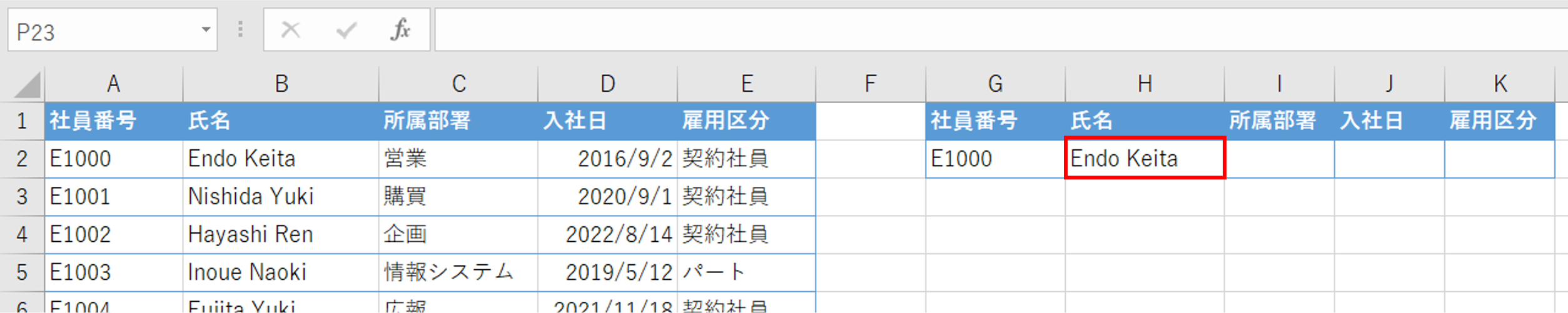 これで、社員番号を変えるだけで氏名が自動的に切り替わるようになります。